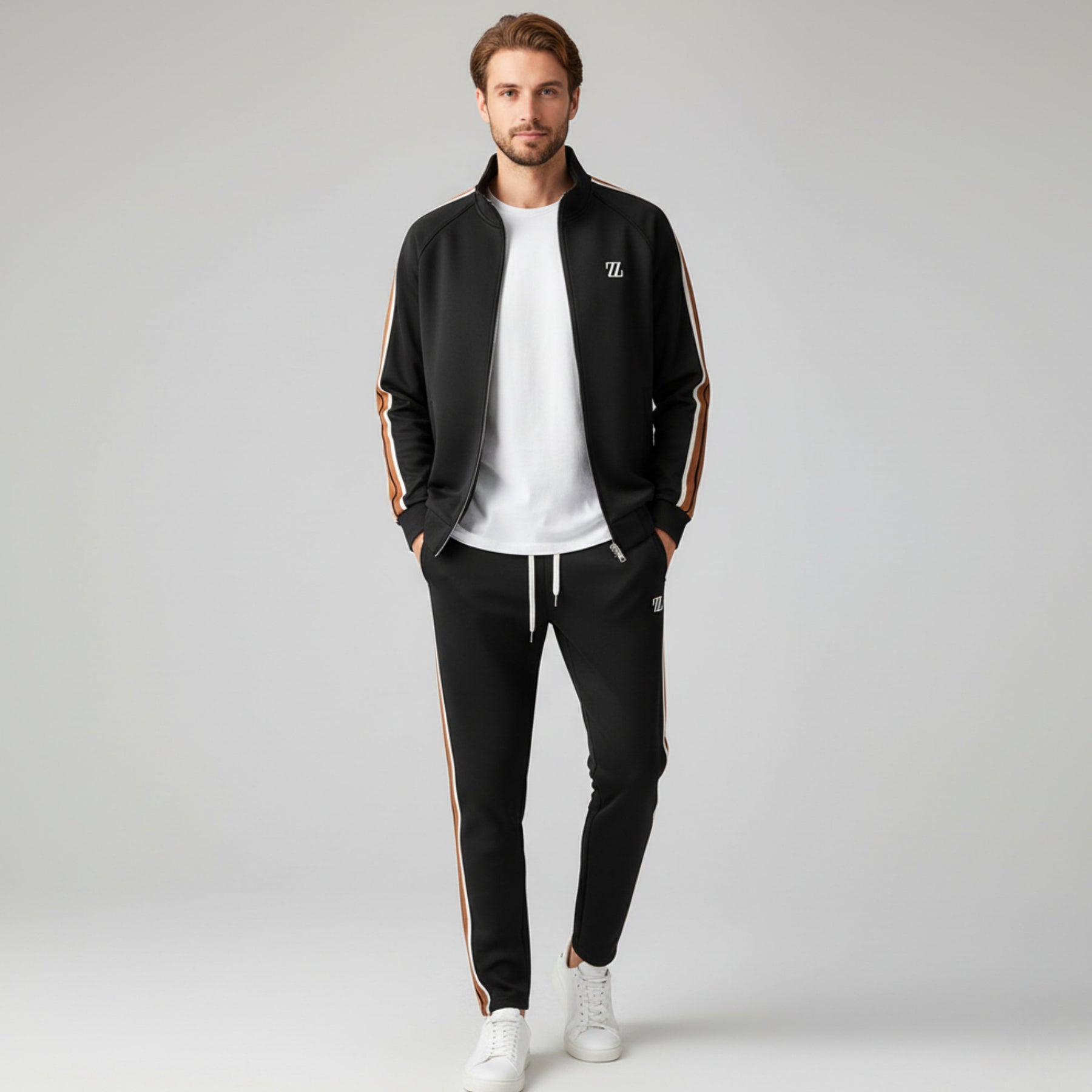Męski Komplet Dresowy  został zaprojektowany z myślą o współczesnym mężczyźnie w ciągłym ruchu. Ten wszechstronny, dwuczęściowy zestaw oferuje zarówno styl, jak i praktyczność, zawierając bluzę na pełny zamek i pasujące spodnie z bezpiecznym, regulowanym pasem. Subtelne boczne paski na bluzie dodają odrobinę dyskretnego stylu, czyniąc ten zestaw funkcjonalnym wyborem do różnorodnych aktywności.