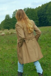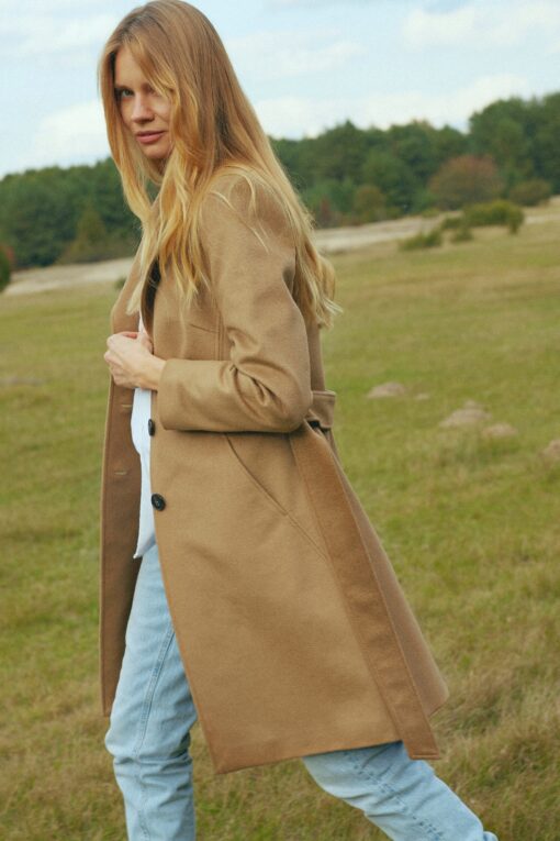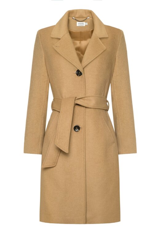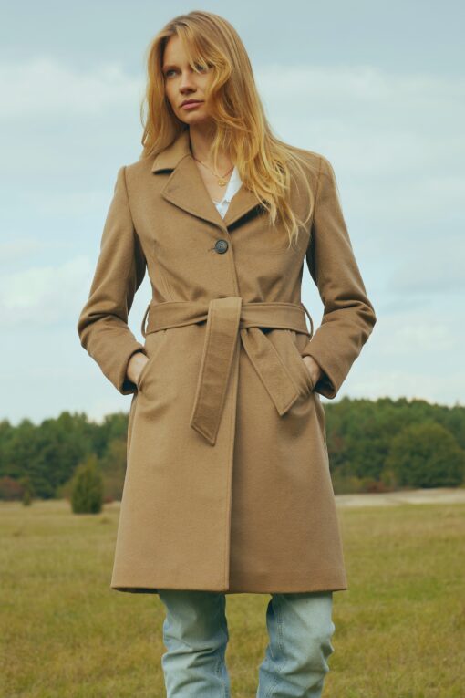 Klasyczny, jednorzędowy, kamelowy płaszcz uszyty ze szlachetnej mieszanki wełen*. Lekko taliowany, z możliwością przewiązania paskiem w talii optycznie wysmukla sylwetkę. Ma średniej wielkości klapy oraz oryginalne cięcia z kieszeniami. Malutki guzik w górnej części klap, pozwala zapiąć je przy kołnierzu tworząc stójkę – idealna na wietrzne dni. Płaszcz został docieplony delikatną otuliną wełnianą, dzięki czemu nosimy go jesienią oraz w łagodne zimowe dni.